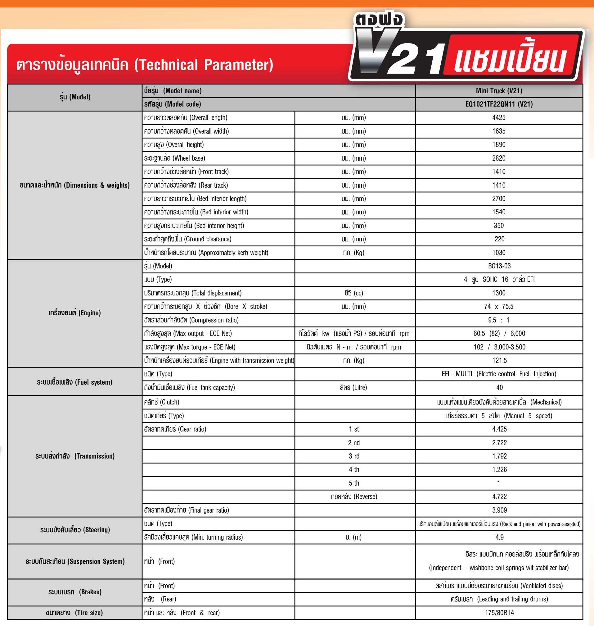 “ตงฟง V21 แชมเปี้ยน” มาพร้อมเครื่องยนต์เบนซิน รหัส BG13-03 แบบ 4 สูบแถวเรียง SOHC 16 วาล์ว หัวฉีด EFI ขนาด 1.3 ลิตร ให้กำลังสูงสุด 82 แรงม้า ที่ 6000 รอบต่อนาที แรงบิดสูงสุด 102 นิวตันเมตร ที่ 3,000 -3500 รอบต่อนาที ส่งกำลังผ่านเกียร์ธรรมดา 5 สปีด และมีถังน้ำมันความจุ 40 ลิตร