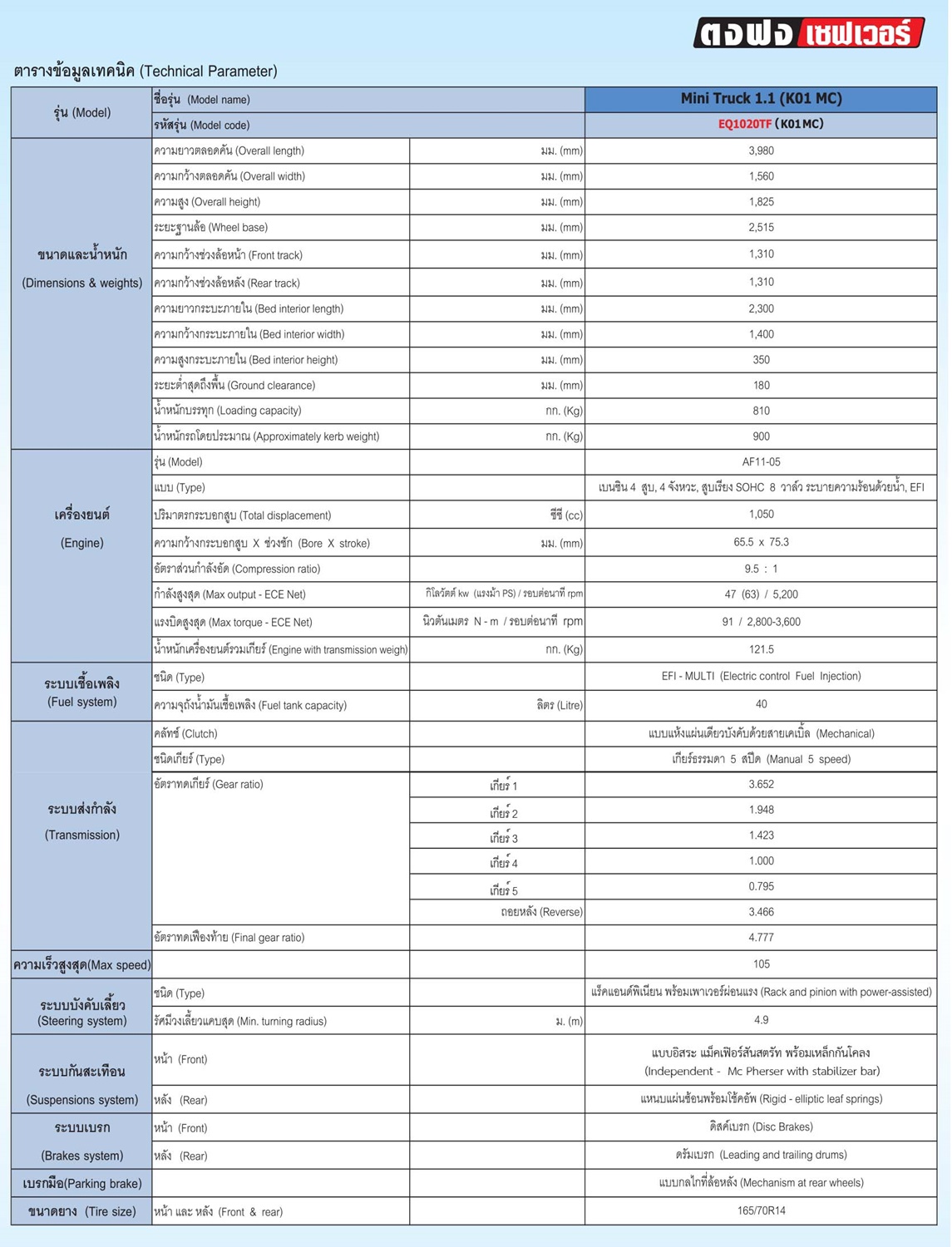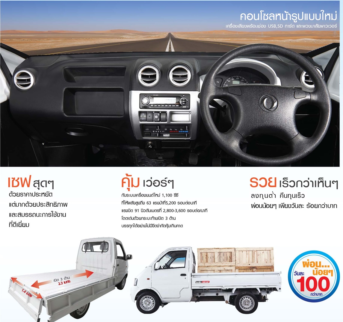 กระบะขนาดเล็กอเนกประสงค์“ตงฟง เซฟเว่อร์” คันนี้ไมเนอร์เช้นจ์มาจากรุ่น ตงฟง มินิทรั๊ค มาพร้อมกับเครื่องยนต์ขนาด 1,100 ซีซี ให้กำลังเครื่องยนต์สูงถึง 63 แรงม้า ที่ 5,200 รอบต่อนาที แรงบิดสูงสุด 91 นิวตันเมตร ที่ 2,800 – 3,600 รอบต่อนาที ระบบเกียร์ธรรมดา 5 สปีด