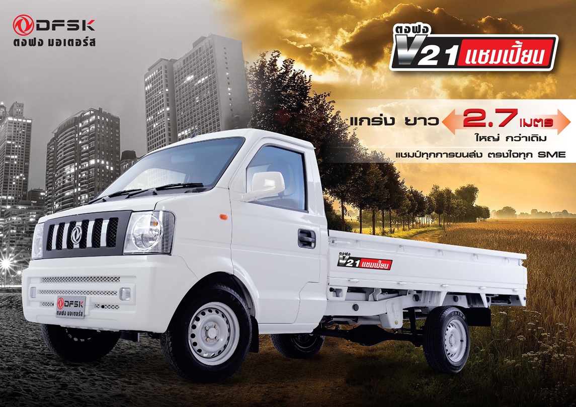 “ตงฟง V21 แชมเปี้ยน” รถกระบะขนาดเล็กอเนกประสงค์ด้วยรูปโฉมภายนอกจะมีหน้าตาคล้ายรถกระบะหัวเดียวที่มีใช้งานทั่วไป แต่จะมีขนาดตัวถังเล็กกว่า ในขณะที่ถ้านำมาเปรียบเทียบกับรถรุ่นก่อนๆ ของค่ายตงฟงเอง จะเห็นว่า “ตงฟง V21 แชมเปี้ยน” นั้นมีขนาดที่ใหญ่ขึ้นในทุกมิติ ด้านหน้าของ “ตงฟง V21 แชมเปี้ยน” ได้รับการออกแบบเน้นความทันสมัยกว่าโฉมก่อน ด้วยโคมไฟหน้าดวงใหญ่ กระจังหน้าสีดำด้านพร้อมซี่แนวตั้งโครเมี่ยม กันชนหน้าพร้อมไฟตัดหมอก มากันที่ด้านท้ายที่ถือเป็นความโดดเด่นในการใช้งานก็คือ กระบะท้ายแบบอเนกประสงค์ขนาดยาวใหญ่มากกว่ารุ่นเดิม ด้วยความยาว 2,700 ม.ม. กว้าง 1,540 ม.ม. และความสูงของกระบะภายใน 365 ม.ม. สามารถเปิดท้ายได้ 3 ด้าน ไม่ติดซุ้มล้อ จึงทำให้ใช้งานบรรทุกของได้มากกว่าเดิม โดย “ตงฟง V21 แชมเปี้ยน” มีความยาวตลอดคัน 4,425 ม.ม. ความกว้างตลอดคัน 1,635 ม.ม. และ สูง 1,690 ม.ม. ระยะฐานล้อ 2,820 ม.ม. ถึงตรงนี้อยากบอกว่า เท่าที่สังเกตงานสี และการประกอบตัวถัง ถือว่าดูดีมีความเรียบร้อยกว่าเมื่อก่อนมาก